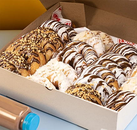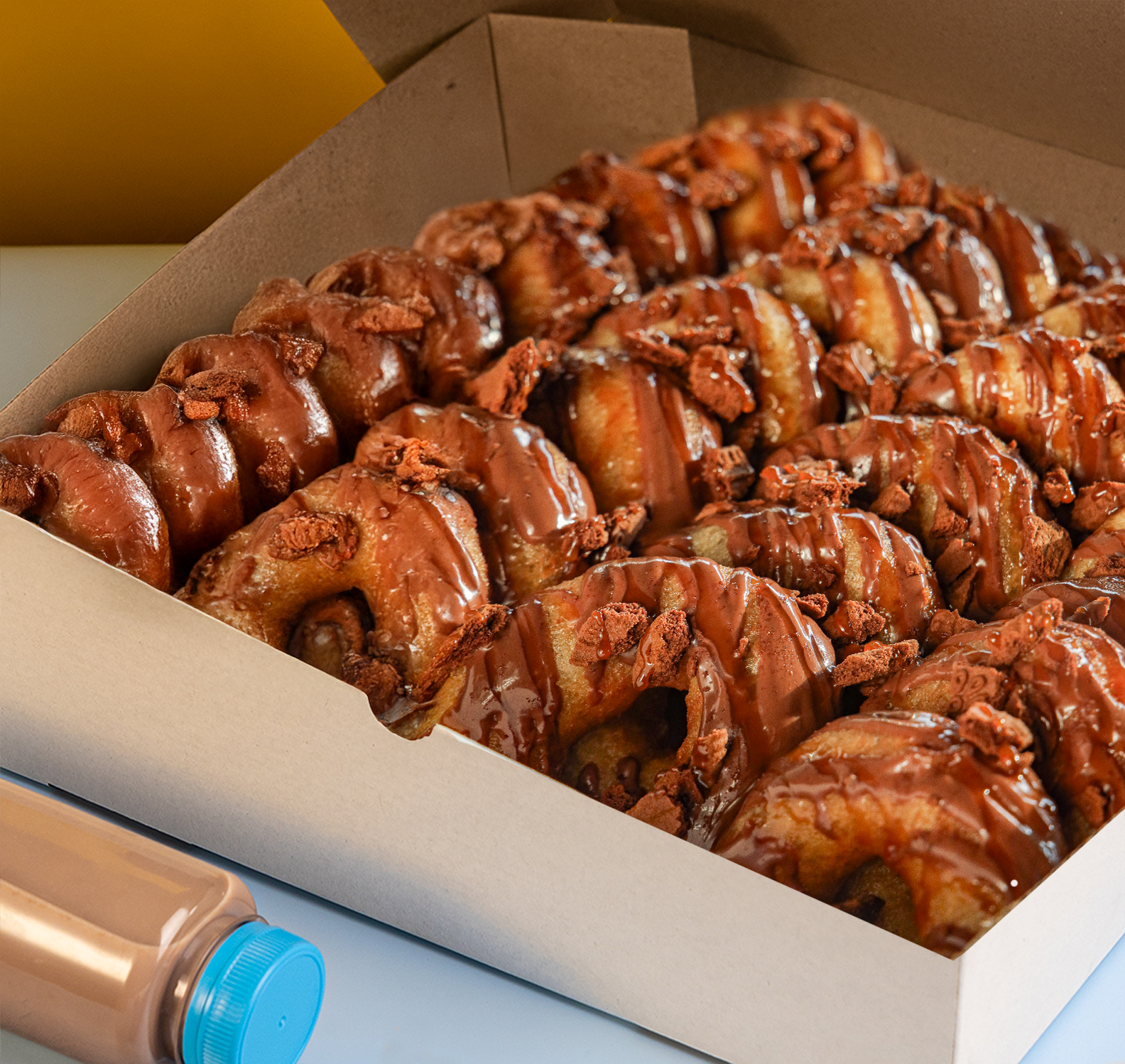Շոկոլադով, սպիտակ գլազուրով, կառամելով, կոկոսի փաթիլներով, մանրացված նուշով, աղի գետնանուշով և շոկոլադի հատիկներով պատված պոնչիկներ