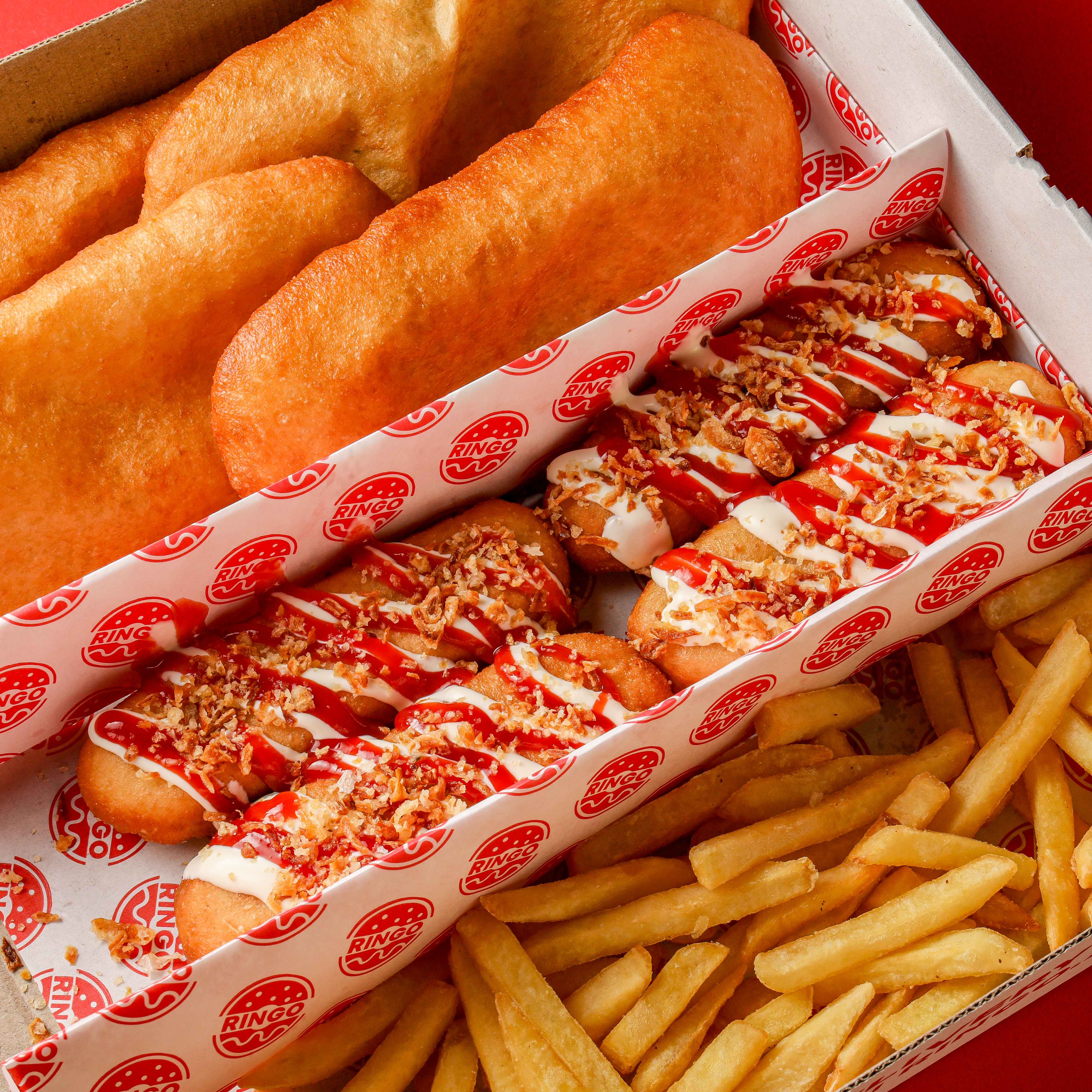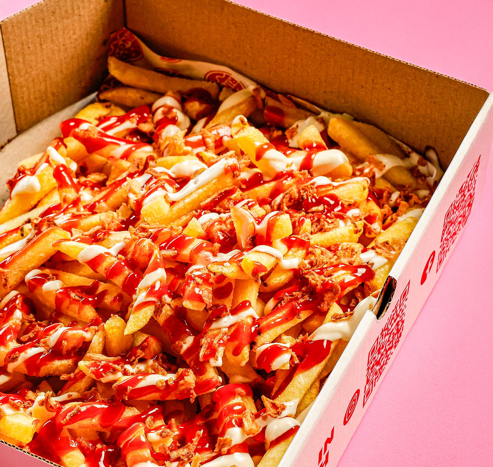 կետչուպով, մայոնեզով եւ սոխի չիփսով